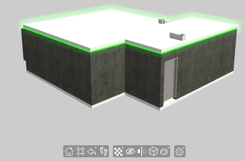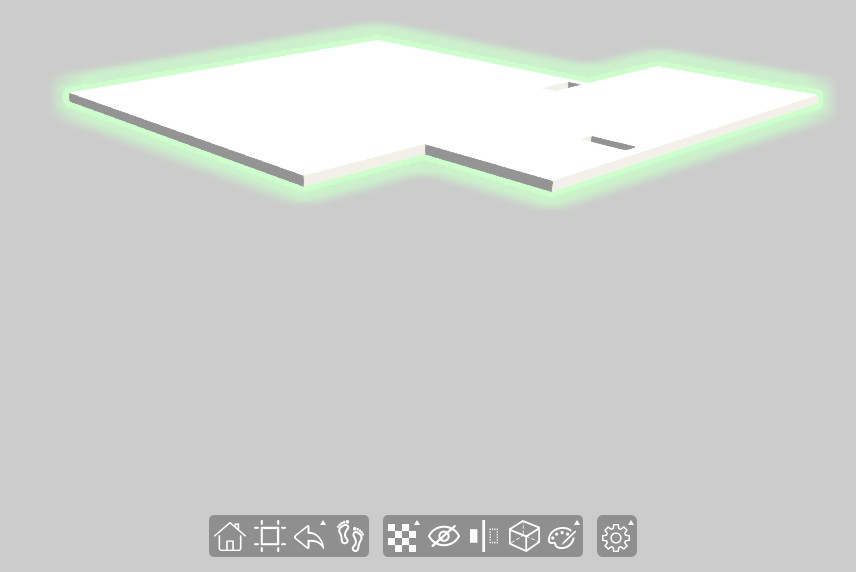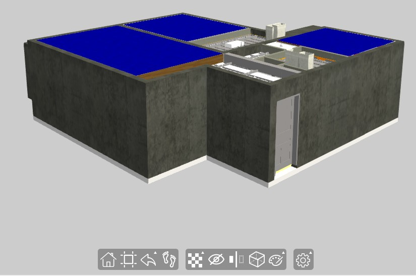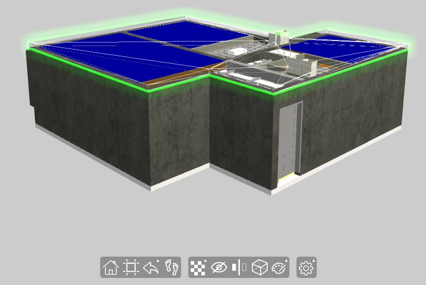 下图展示了主界面。主界面中间为模型展示区;左上角为视图控制器;顶部中间为信息反馈区;右侧为高级功能按钮及其对应的操作面板;底部中间为常用功能按钮,包含:视图操作按钮、构件操作按钮及通用设置按钮。常用功能按钮如果有扩展操作面板,如构件透明按钮,则在该按钮图标右上角显示“▲”。